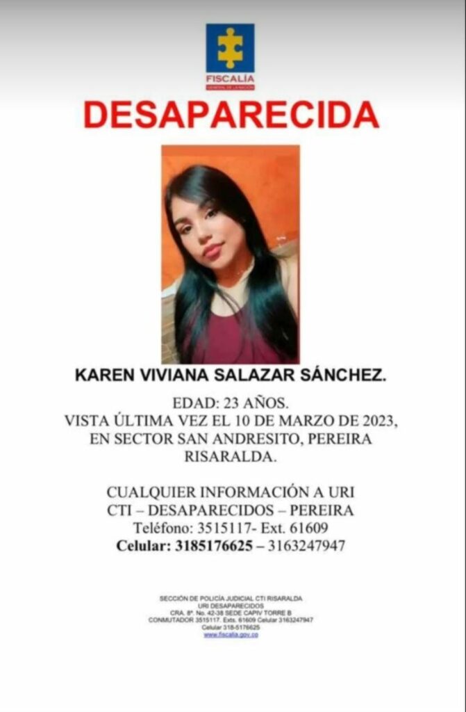 Hasta la sede de la Fiscalía en Pereira llegó Adriana Sánchez para denunciar la desaparición de su hija. Karen Viviana Salazar Sánchez tiene 23 años, es madre de un niño de 3 añitos y el viernes quedó en verse con un hombre, pero desde entonces no ha aparecido.