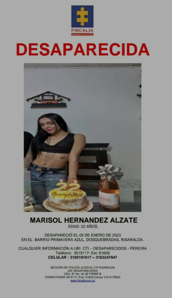 Desde el pasado 3 de enero la familia de Marisol Hernández Alzate busca alguna pista sobre ella. La joven salió de su casa en el barrio Primavera Azul, de Dosquebradas, y hasta el sol de hoy no regresó. Lo peor es que los que la conocían “no quieren decir nada, parece que estuvieran amenazados”.