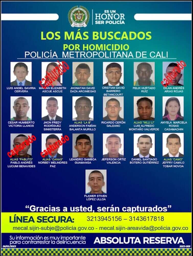 La Policía Metropolitana de Cali ofreció recompensa y absoluta reserva por información que permita la captura de cada actor delincuencial. Son dos afiches con las fotografías y nombres de los involucrados en afectaciones a la vida, integridad y patrimonio económico de todos los habitantes de la capital vallecaucana.