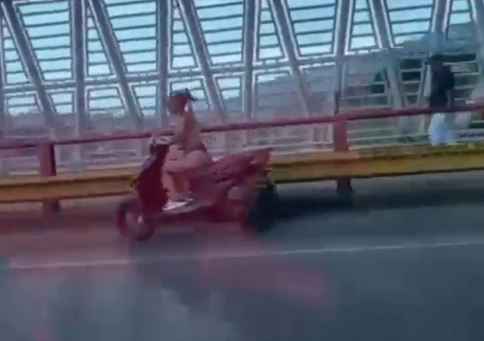 La grabación la hicieron otras mujeres desde un vehículo particular y en él se ve a otra femenina conduciendo una motocicleta mientras cruza el viaducto César Gaviria Trujillo en sentido Dosquebradas – Pereira, sin brasier y en tangas.
