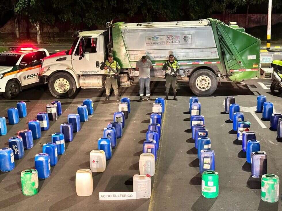 En una operación sorprendente, la Policía del Valle del Cauca logró incautar más de 475 galones de ácido sulfúrico que eran transportados ilegalmente en un camión de recolección de basura. Este químico, utilizado en la fabricación de cocaína y explosivos, fue hallado oculto entre basura y escombros en la vía Villarica – Palmira, a la altura del kilómetro 21.