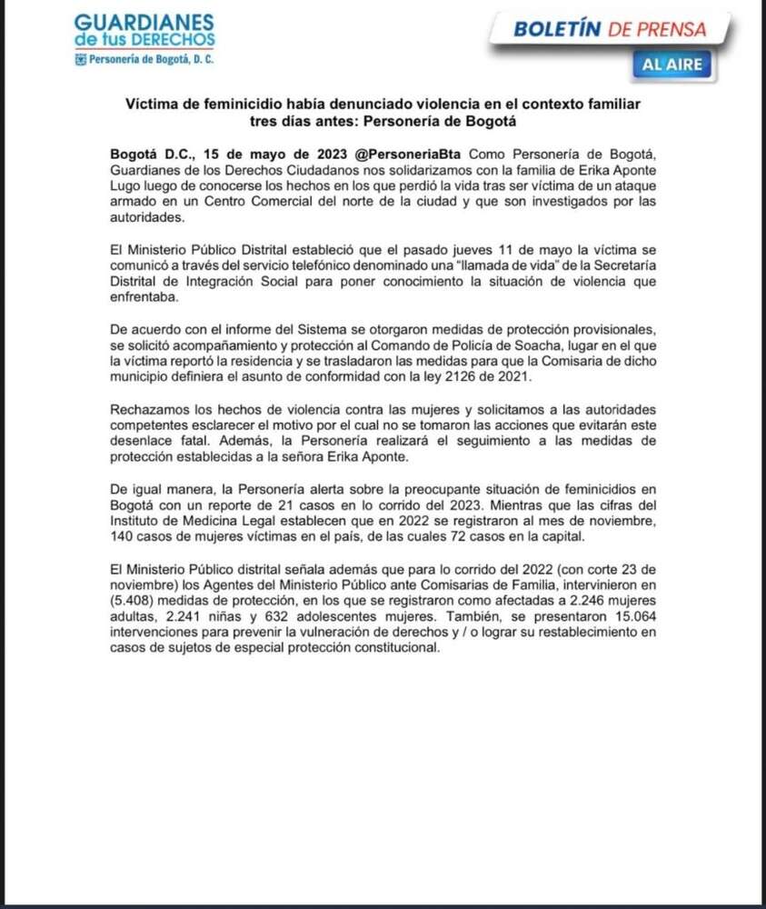 El organismo defensor de Derechos Humanos solicitó a las autoridades esclarecer los motivos por los que no se tomaron las acciones que evitaran “este desenlace fatal”. Además, señala que hará seguimiento a las medidas de protección establecidas a la señora Erika Aponte.