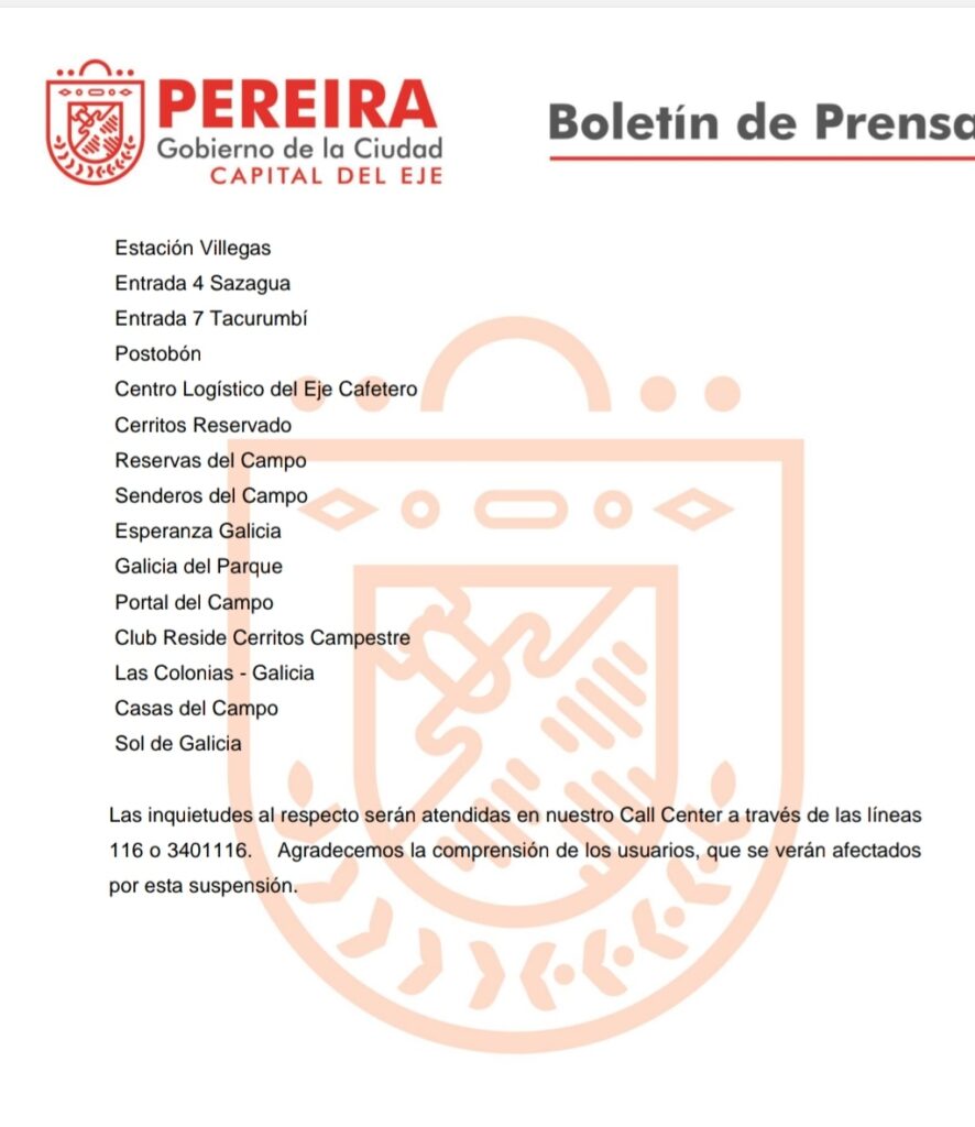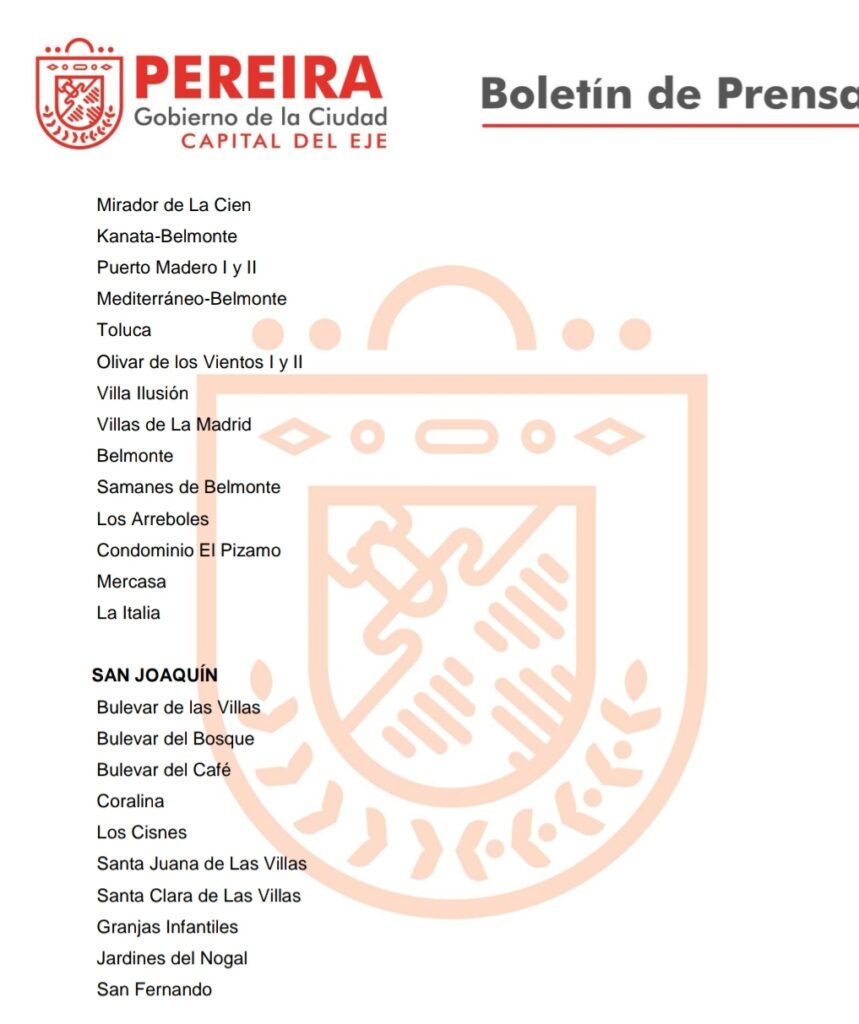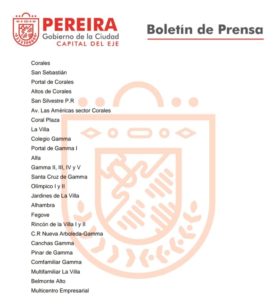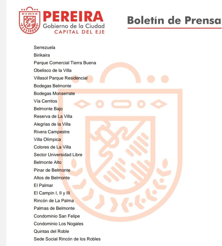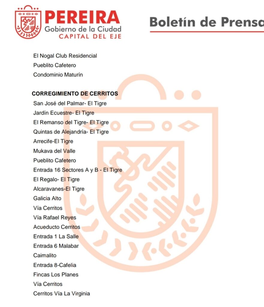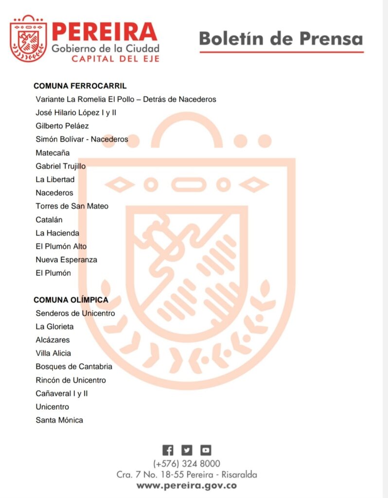 Las Comunas Ferrocarril, Olímpica, San Joaquín (solo algunos sectores) y el corregimiento de Cerritos son los afectados por la suspensión, dice un comunicado de prensa de la Alcaldía de Pereira.