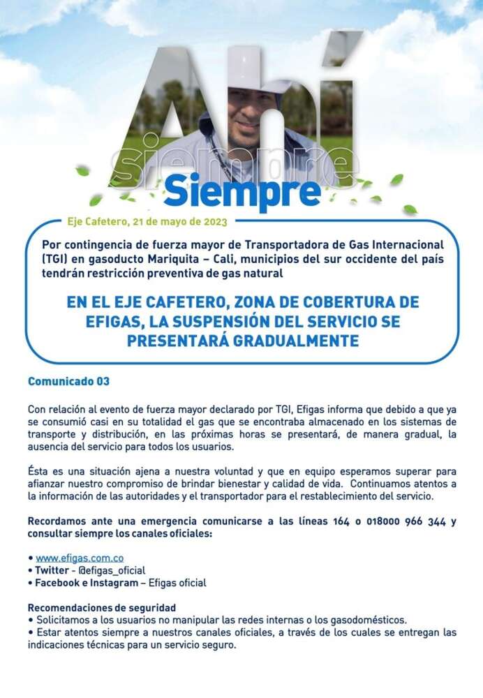 En un comunicado, la empresa Efigas explicó que “ya se consumió casi en su totalidad el gas que se encontraba almacenado en los sistemas de transporte y distribución”. Por esa razón, en las próximas horas, y de manera gradual, habrá ausencia del servicio en los departamentos de Caldas, Quindío y Risaralda.