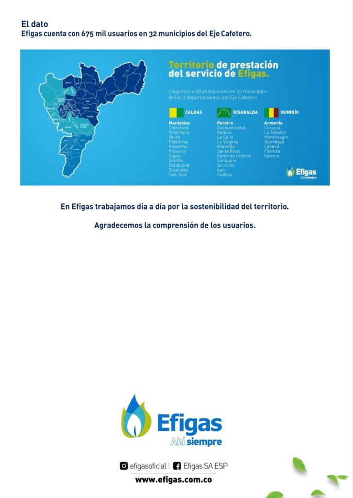 Jorge Enrique González Cardona, subgerente Técnico de Efigas, solicitó a los usuarios no manipular las redes internas o los gasodomésticos y estar atentos a los canales oficiales a través de los cuales entregan las indicaciones técnicas para un servicio seguro.
