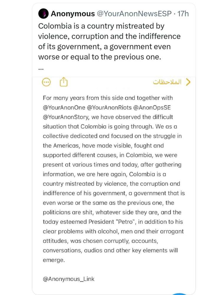 “Colombia es un país maltratado por la violencia, la corrupción y la indiferencia de su gobierno. Un gobierno aún peor o igual al anterior. Los políticos son una mierd@ del lado que sean y el hoy presidente Petro además de sus claros problemas con el alcohol, los hombres y sus aptitudes arrogantes, fue elegido corruptamente. Surgirán relatos, conversaciones, audios y otros elementos clave”. Este es el escrito que se observa en la supuesta cuenta del colectivo Anonymous.
