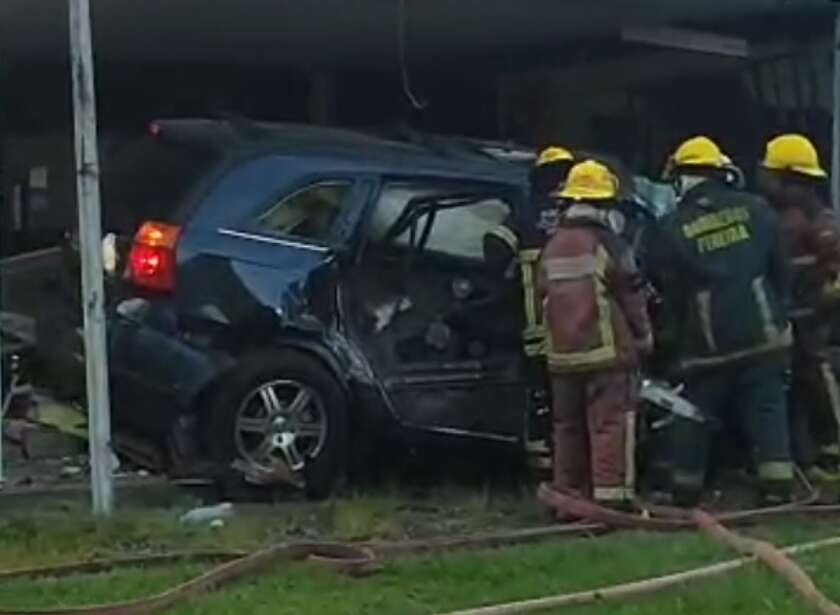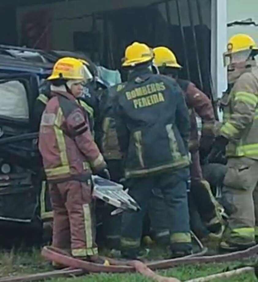 Nueve unidades del Cuerpo Oficial de Bomberos de Pereira se movilizaron en dos vehículos para realizar las maniobras de rescate, que duraron unos 30 minutos, aproximadamente, hasta que pudieron sacar al conductor del auto estrellado.