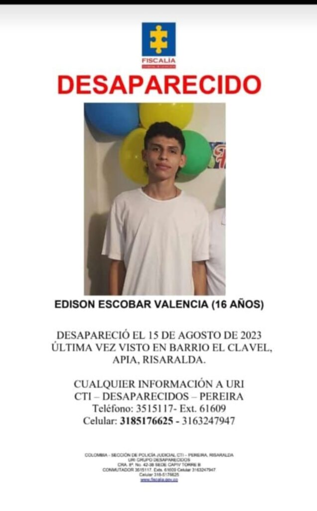 Hay conmoción en el municipio de Apía, departamento de Risaralda, tras el trágico hallazgo de Edison Escobar Valencia, un joven de apenas 16 años, que había sido reportado como desaparecido el pasado 15 de agosto. La tarde de este sábado lo hallaron muerto.