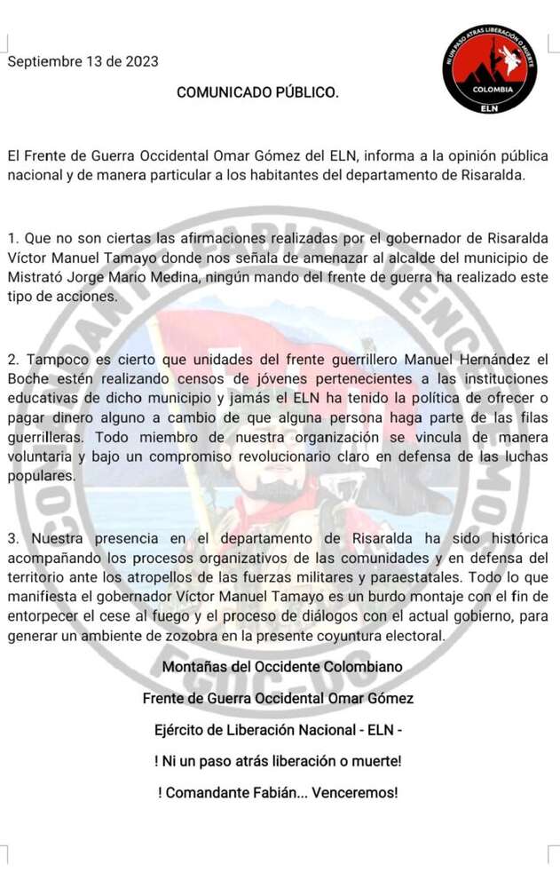 En un comunicado emitido el pasado 13 de septiembre, el Frente de Guerra Occidental Omar Gómez, del ELN, dijo que es falso que el grupo armado haya amenazado al alcalde de Mistrató, así como también la realización de censos y el presunto ofrecimiento de dinero para reclutar nuevos integrantes.