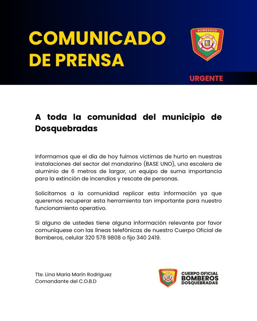 El incidente causó preocupación entre la comunidad y las autoridades. Según testigos, mientras se realizaban los ejercicios de práctica, una persona desconocida se acercó al lugar y se llevó la escalera. Hasta el momento, no se ha identificado al responsable ni se cuenta con información precisa sobre cómo se realizó el robo.