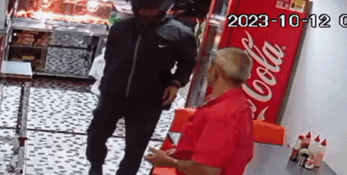 En las últimas horas se divulgó el video del negocio ubicado en el barrio La Villa, de Pereira. Se ve cuando llega una motocicleta, el conductor se baja y jamás se quita el casco. Luego intimida a un hombre de la tercera edad y comete su fechoría.