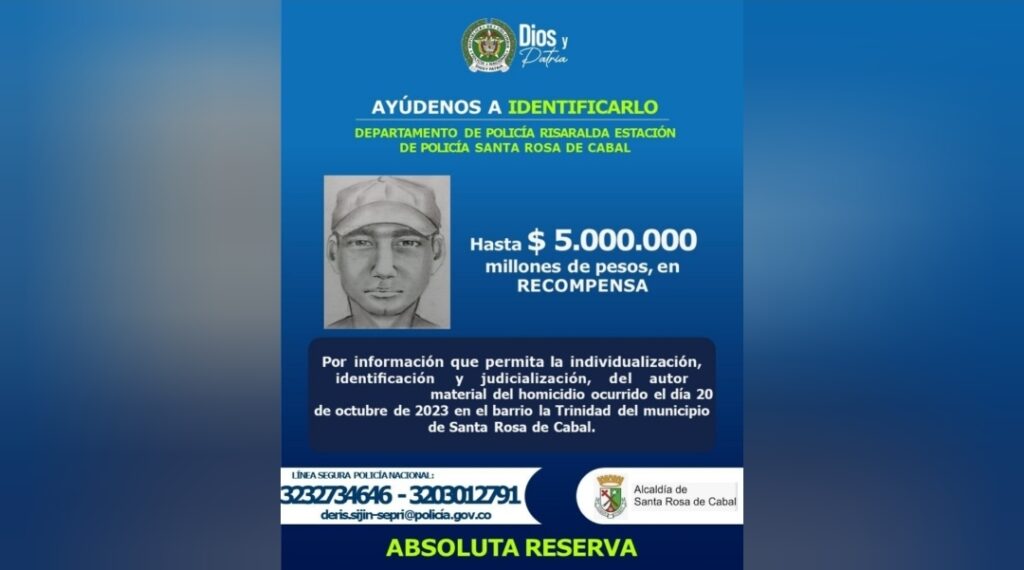 Un cartel publicado por la Policía de Risaralda dice que se ofrecen hasta $5 millones de recompensa por información que permita la individualización y judicialización del autor material del homicidio.
