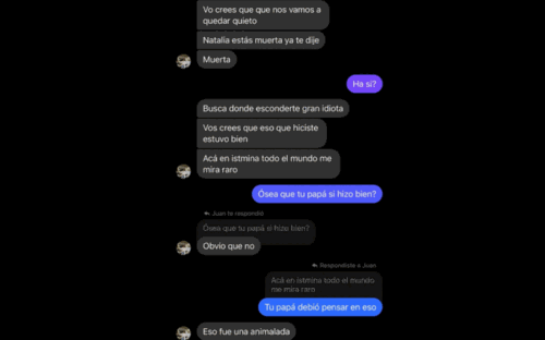 Desde ese momento llovieron las amenazas: “Natalia estás muerta, ya te dije, muerta” se lee en algunos de los mensajes que le escribieron a su teléfono. En otros le advierten: “Alcanza a esconderte gran idiota”. El autor de las amenazas sería su propio hermano.