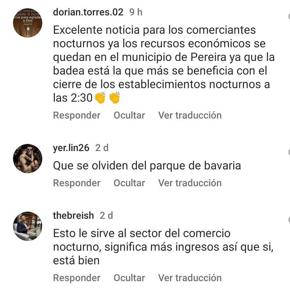 “Excelente noticia para los comerciantes nocturnos y los recursos económicos se quedan en el municipio de Pereira, ya que La Badea es la que más se beneficia con el cierre de los establecimientos a las 2:30am”, escribió en la cuánta de Instagram Dorian Torres.