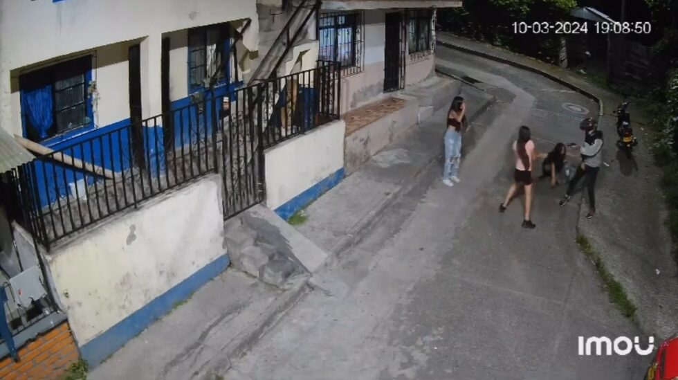 Una cámara de seguridad captó el momento en el que dos motociclistas agreden a tres niñas menores de edad y las apunta con un arma de fuego en el barrio Venus, de Dosquebradas. Los hechos ocurrieron este domingo a las 07:08 de la noche, según la grabación.