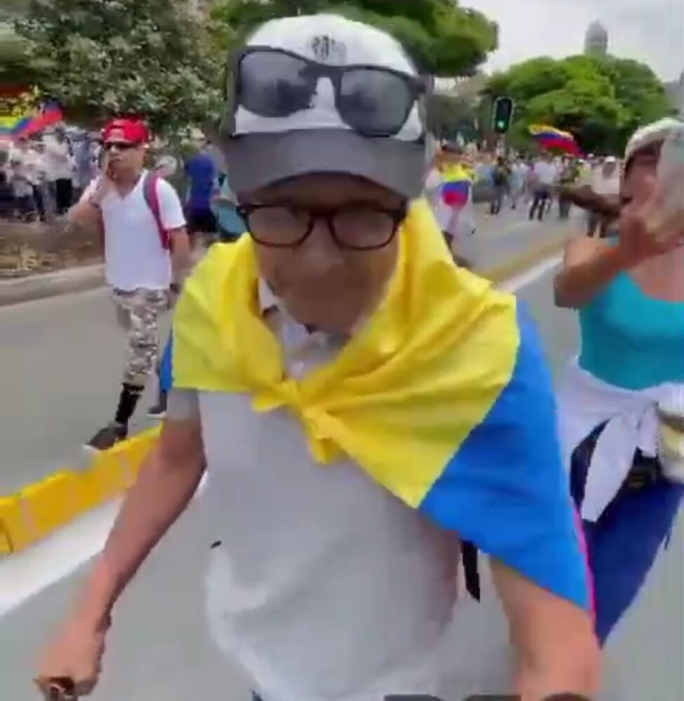 Con bastón en mano, el hombre decidió acompañar la jornada de marchas nacionales que se celebraron este domingo en contra del gobierno de Gustavo Petro.