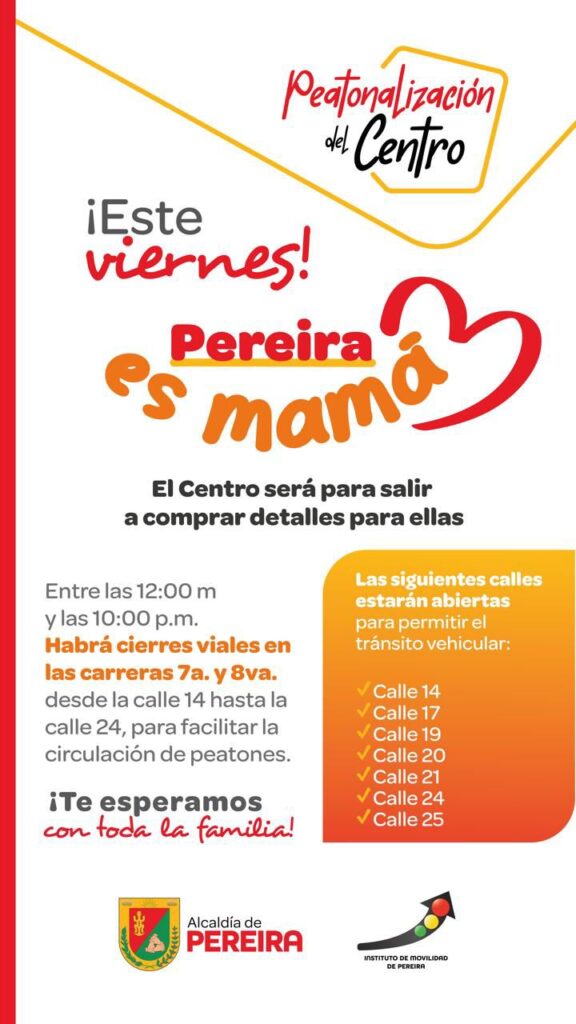 La administración municipal de Pereira implementará cierres viales este viernes en el centro de la ciudad, con el fin de promover la peatonalización y facilitar las compras por el Día de la Madre.