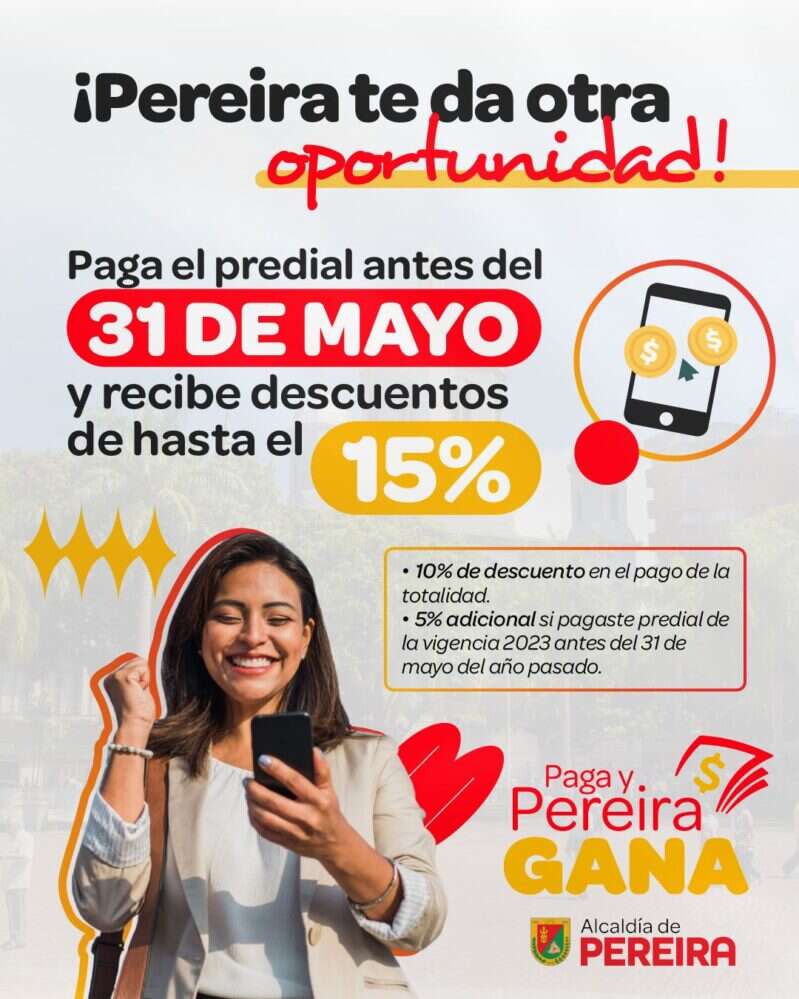 Bermúdez reiteró la invitación a todos los pereiranos para que aprovechen los descuentos disponibles hasta el 31 de mayo y cumplan con el pago del impuesto predial, de manera que puedan contribuir al desarrollo y crecimiento de la ciudad.