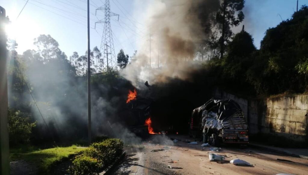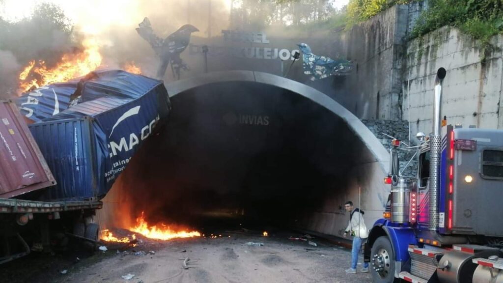 “Una colisión entre dos tractocamiones provoca un incendio en el túnel Los Azulejos, en el kilómetro 32, que genera cierre total en la vía Calarcá – Cajamarca”, informó el Instituto Nacional de Vías (Invías).