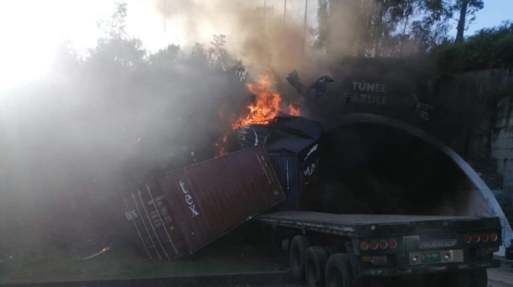 Uno de los vehículos siniestrados que transportaba dos contenedores, impactó de frente contra la estructura del túnel, lo que provocó una explosión inmediata, dejando atrapado e incinerado al conductor en su cabina.
