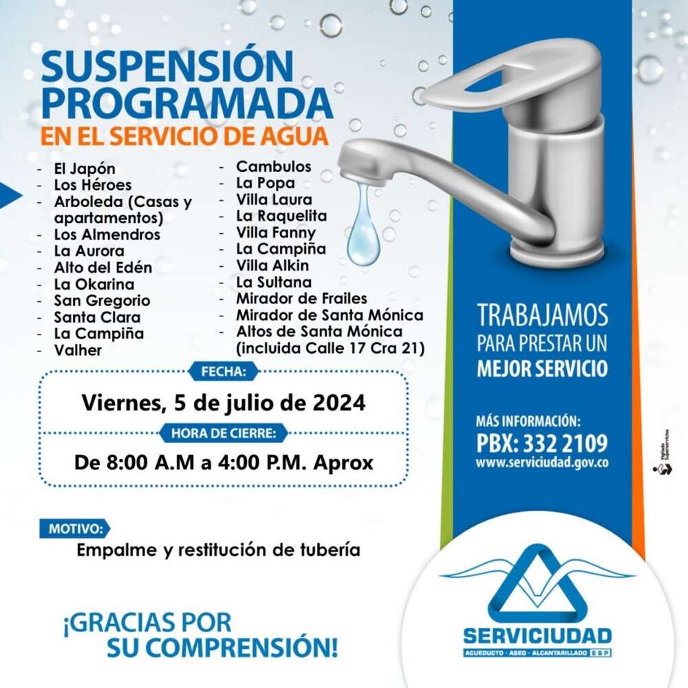 Habrá interrupción en el suministro de agua potable en 23 barrios mientras se realizan trabajos de mantenimiento y empalme de tuberías. El corte está programado desde las 08:00 de la mañana hasta las 04:00 de la tarde, aproximadamente.