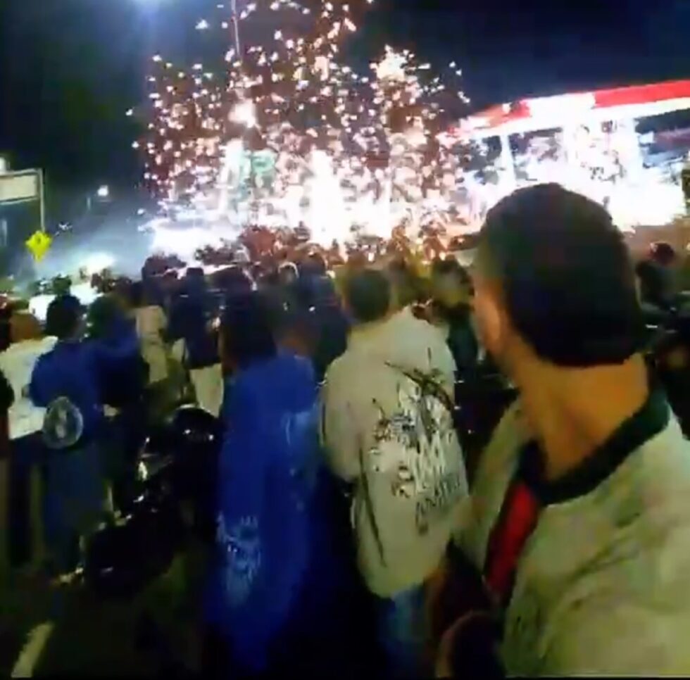 Los presentes se habían congregado para presenciar la competencia clandestina de vehículos. En un momento de imprudencia, varios jóvenes lanzaron fuegos artificiales a escasos metros del lugar de servicio.