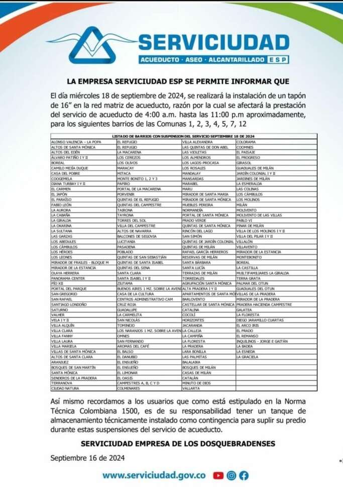 La empresa Serviciudad informó que siete comunas se quedarán sin suministro de agua, desde las 04:00 de la madrugada hasta las 11:00 de la noche, debido a la instalación de un tapón de 16 pulgadas en la red matriz de acueducto.