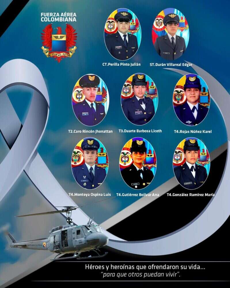 La tragedia ocurrió durante una misión de evacuación aeromédica. La Fuerza Aérea Colombiana (FAC) confirmó el fallecimiento de los uniformados Julián Perilla Pinto, Édgar Durán Villareal, Jhonattan Caro Rincón, Liceth Duarte Barbosa, Karel Rojas Núñez , Luis Montoya Ospina, Ana María Gutiérrez Bolívar y María González Ramírez.