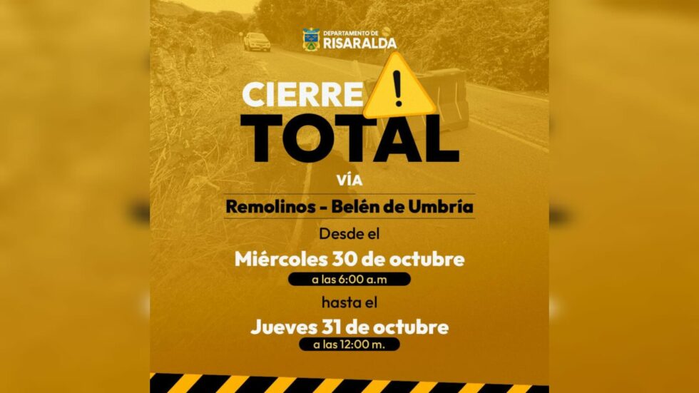 Este miércoles 30 de octubre, a partir de las 6:00 a.m. y hasta el jueves 31 de octubre a las 12:00 p.m., la vía Remolinos en Belén de Umbría estará cerrada completamente para llevar a cabo una intervención de rehabilitación. La medida busca reparar los daños en el sector de La Porcícola La Manuela, una zona afectada por el paso constante de vehículos, motocicletas y peatones.