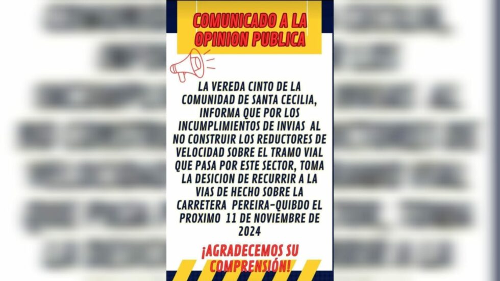 Este domingo 11 de noviembre, la comunidad de El Corregimiento de Santa Cecilia, en Pueblo Rico, tomará medidas de protesta bloqueando la vía Panamericana debido a los incumplimientos de INVIAS en la construcción de reductores de velocidad en la transversal.