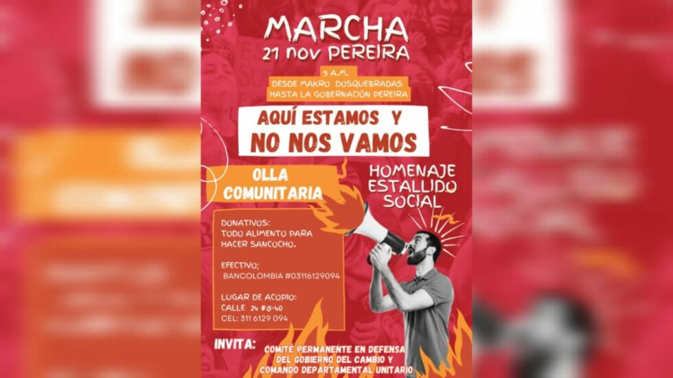 Este 21 de noviembre, Pereira será escenario de una movilización en el marco de la convocatoria nacional que conmemora el quinto aniversario del estallido social de 2019.