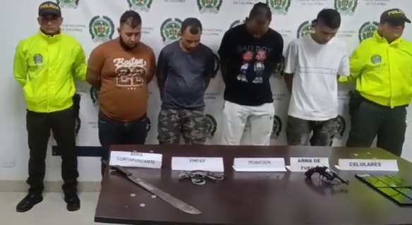 Durante el operativo, la Policía incautó un arma de fuego tipo revólver, un machete, municiones, siete celulares y una cuerda. Los presuntos responsables, identificados con los alias de “Pantera”, “Janby”, “El Gordo” y “Juanca”, fueron capturados en flagrancia y enfrentarán cargos por tortura, fabricación y porte ilegal de armas, y la instrumentalización de menores de edad.