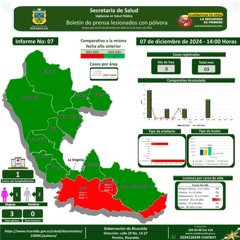 La Secretaría de Salud de Pereira entregó el reporte tras la celebración de la primera noche de velitas. Allí confirmaron que se registró una persona lesionada por el uso de pólvora durante el sábado 7 de diciembre.