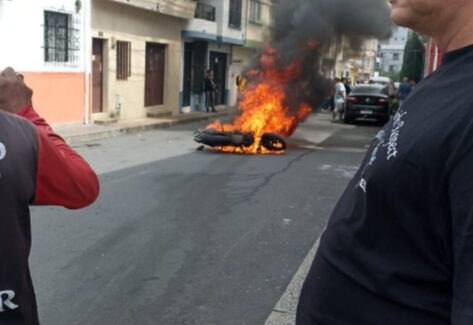 Minutos después, llegó al lugar una patrulla de la Policía Metropolitana, pero no pudo evitar que la misma ciudadanía le prendiera fuego a la motocicleta de los ladrones.