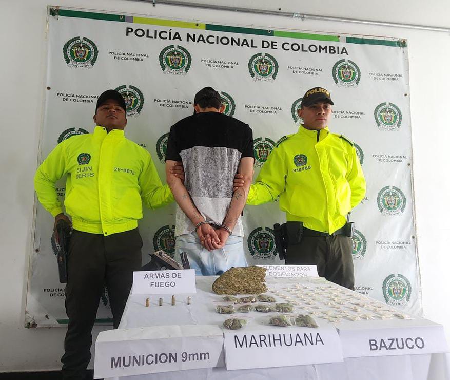 Además, los uniformados incautaron un arma traumática con varios cartuchos, 400 gramos de marihuana y 35 dosis de bazuco, listas para su distribución.