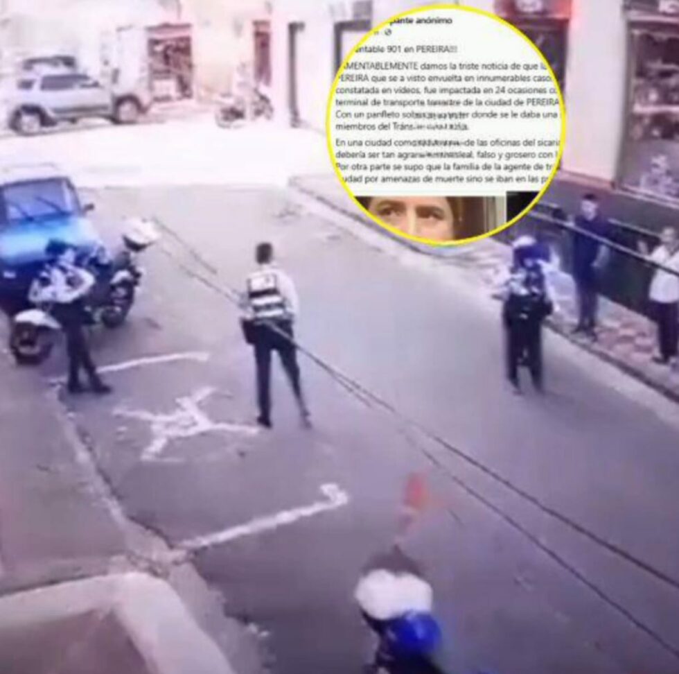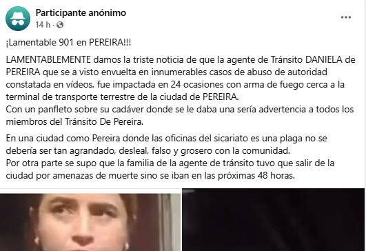 Un participante anónimo publicó la fotografías de la agente de tránsito de Pereira que se vio involucrada en un capítulo de agresión con un ciudadano este lunes. En el texto señala que la mujer había muerto producto de “24 impactos con arma de fuego cerca de la terminal de transporte terrestre”, aunque la información es falsa.