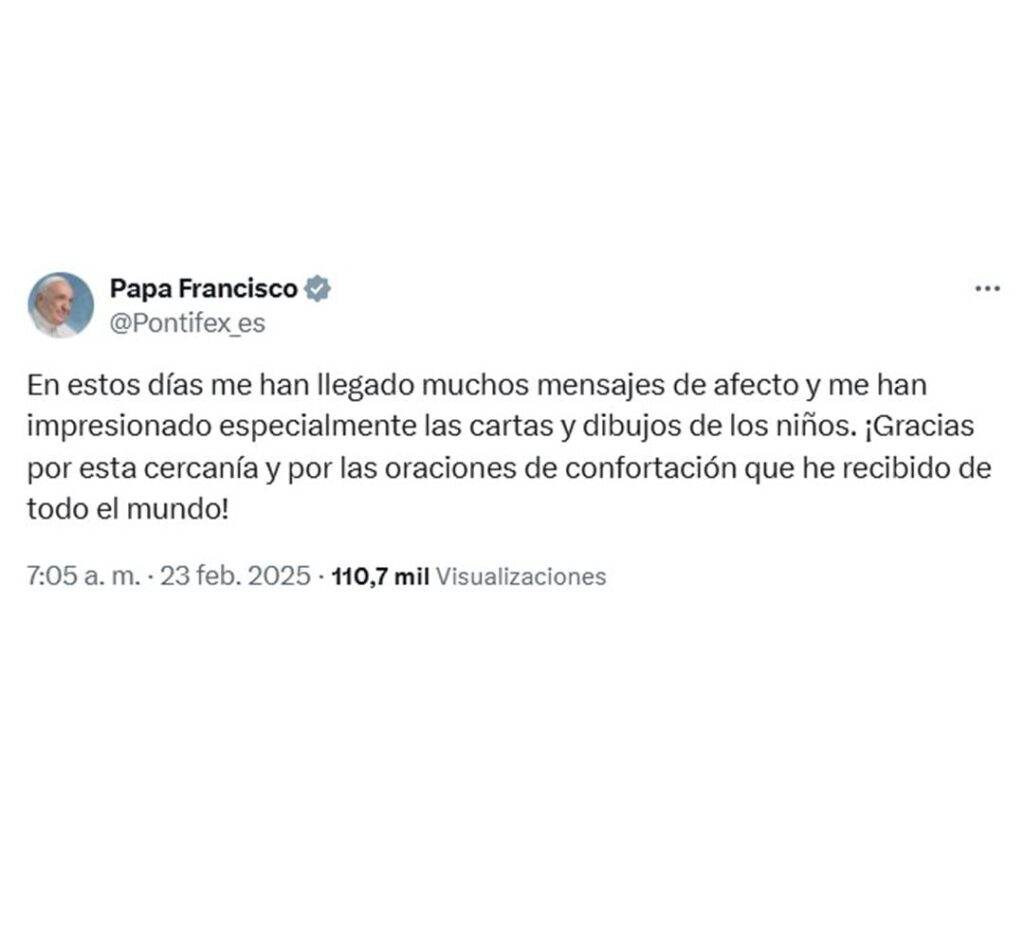 A pesar de encontrarse en estado crítico, el Pontífice se pronunció en sus redes sociales agradeciendo los mensajes de apoyo, sobre todo los mensajes de los niños quienes le han enviado varios dibujos.