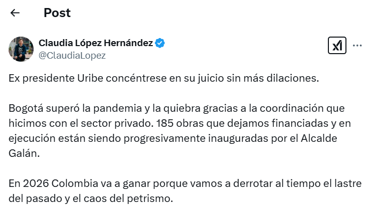 “En 2026, Colombia va a ganar porque vamos a derrotar, al tiempo, el lastre del pasado y el caos del petrismo”, dijo en su trino la exmandataria, quien ha estado en el “ojo del huracán”, por hacer la solicitud de escisión del Partido Verde.