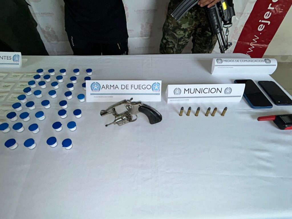 En el lugar incautaron un revólver calibre 38 mm, seis cartuchos del mismo calibre, tres radios de comunicación, dos teléfonos celulares y 320 papeletas de clorhidrato de cocaína.