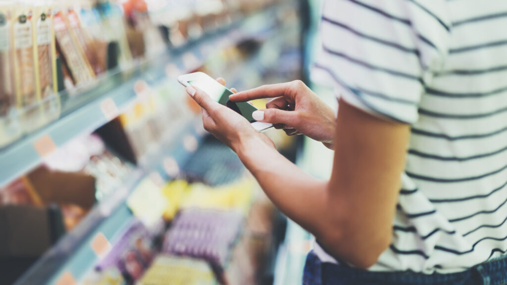 Woman shopping healthy food in supermarket background. Close up view girl buy products using digital gadget in store. Hipster at grocery using smartphone. Person comparing the price of produce
