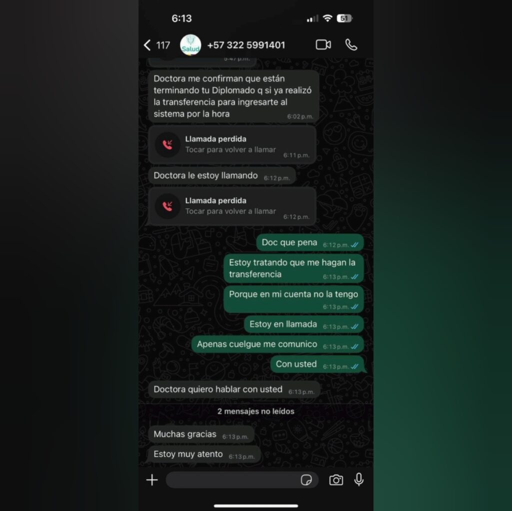Supuestamente, la víctima recibió una llamada de la gerente de la IPS donde trabaja actualmente y en la conversación, la directiva le informó que había entregado su contacto para una oferta de trabajo en Aerocivil, específicamente en el área de antinarcóticos.