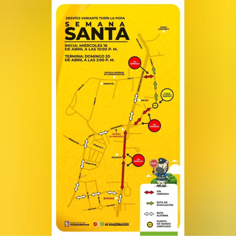 Habrá cierres viales, control policial y rutas alternas para garantizar la seguridad de los feligreses, con motivo de las celebraciones religiosas de la Semana Santa. La Alcaldía de Dosquebradas anunció el plan de contingencia vial.