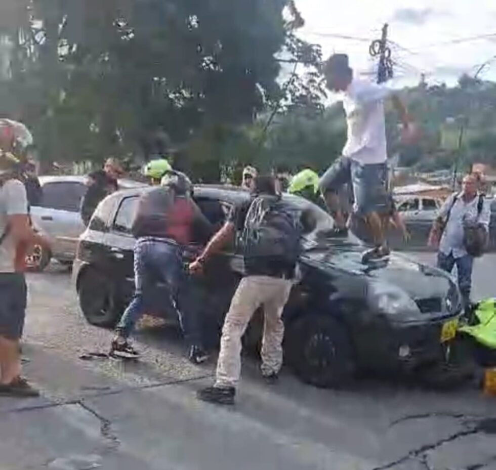 En un video grabado con celular, se ve como el conductor de un vehículo particular arrastró varios metros una moto de la Policía Metropolitana de Pereira. La comunidad reaccionó con furia y terminó por dañar varias partes del automóvil.