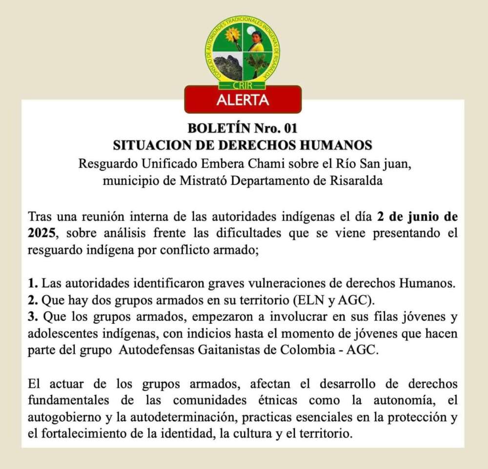 La información tuvo como fuente principal un informe firmado por el propio Consejo de Autoridades Tradicionales Indígenas de Risaralda (CRIR). El boletín, emitido el 2 de junio de 2025 y titulado: “Situación de Derechos Humanos del Resguardo Unificado Embera Chamí sobre el río San Juan”, es contundente.