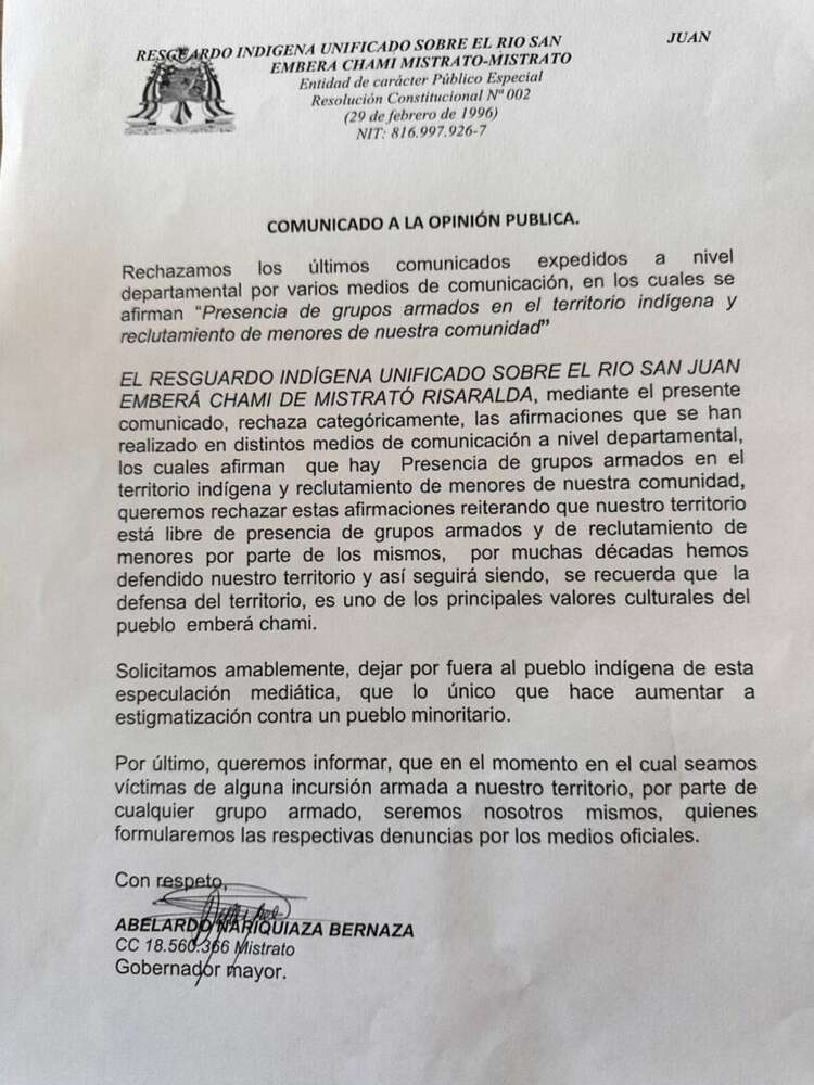 Pero este viernes, una parte de la dirigencia del resguardo San Juan en Mistrató, en voz de su gobernador mayor Abelardo Nariquiaza, lanzó un comunicado en el que acusa a los medios de “generar estigmatización”, de publicar información “sin consultar al cabildo” y de inventarse una situación inexistente.