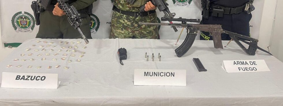 El operativo se realizó en la vereda La Quiebra, zona rural de Santuario. Los uniformados le decomisaron una carabina calibre 38 especial, cinco cartuchos y 31,6 gramos de bazuco, además de varias dosis listas para la venta.