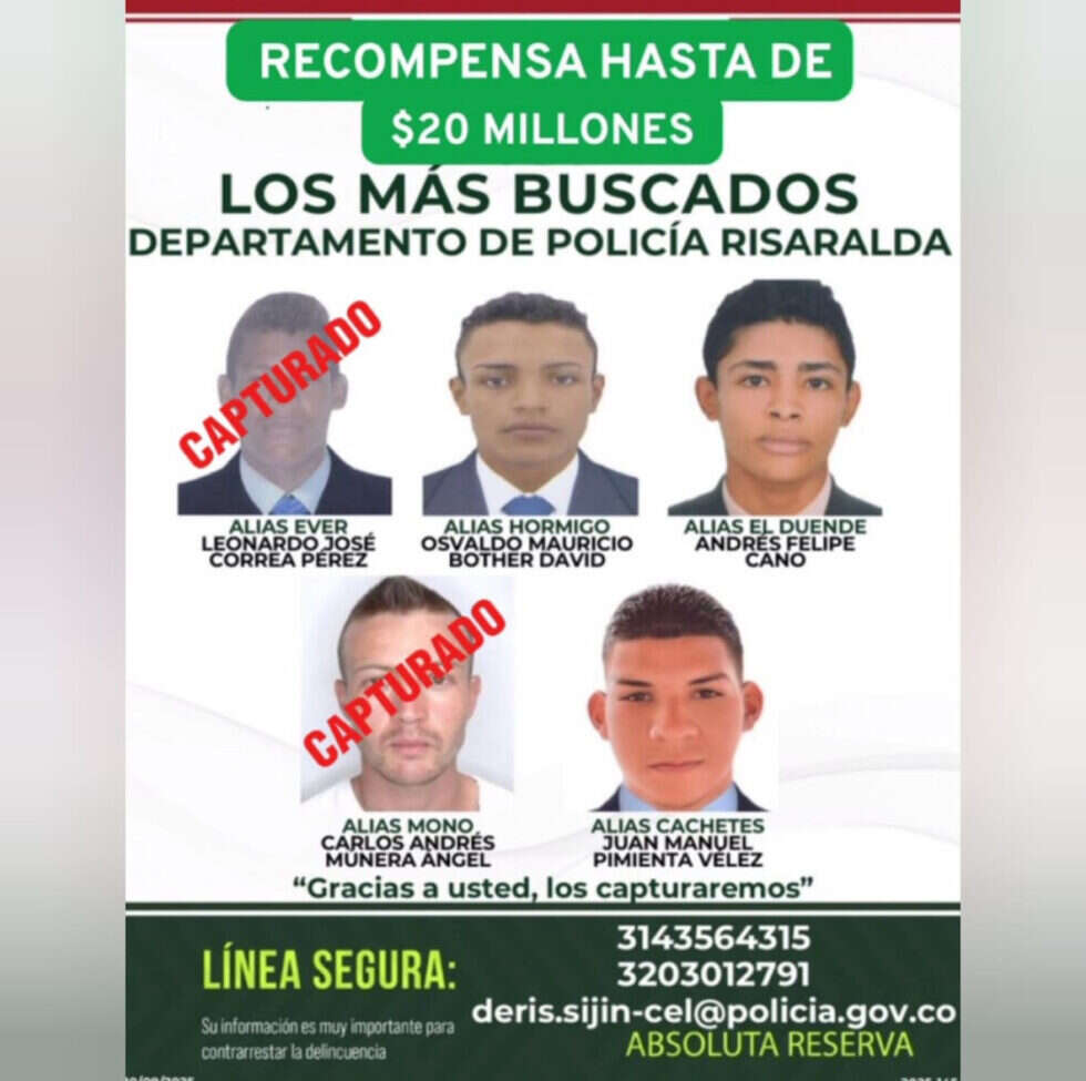 Todos tienen órdenes de captura vigentes y un prontuario que los vincula a crímenes en municipios como Belén de Umbría y Mistrató. Los señalan como autores materiales de homicidios, microtráfico y control territorial en municipios del occidente.