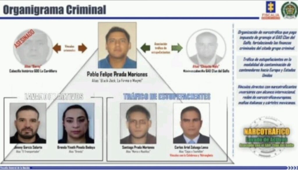 Un expediente de la Fiscalía General de la Nación, señala a Pablo Felipe Prada Moriones, alias Black Jack, como el presunto cabecilla de una red de narcotráfico que financiaba al Clan del Golfo. Parte de su fortuna se movía en Pereira, donde al parecer tenía nexos criminales.