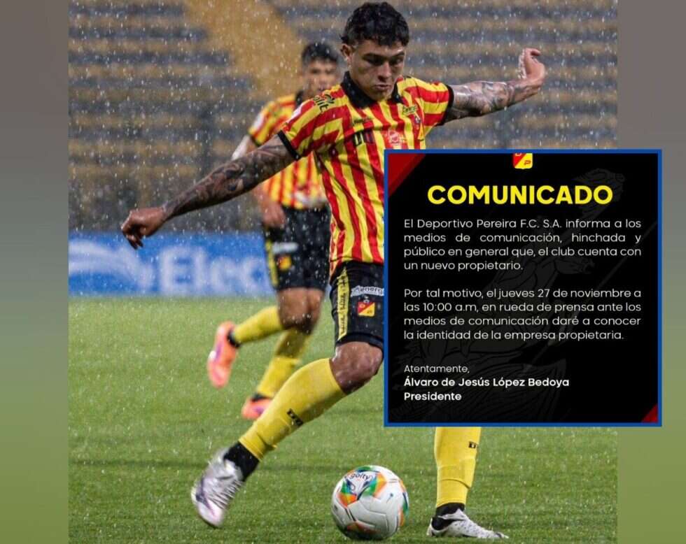 En el mensaje, el club señaló: “El Deportivo Pereira F.C. S.A. informa a los medios de comunicación, hinchada y público en general que, el club cuenta con nuevo propietario”.