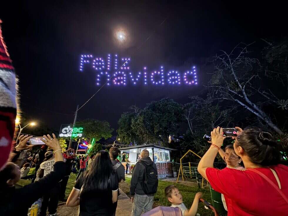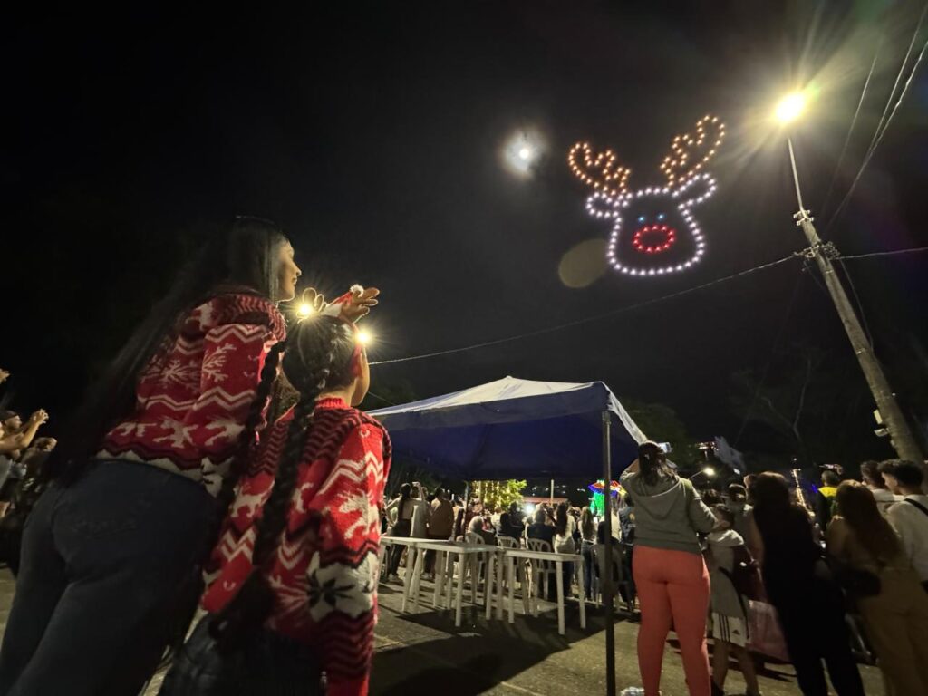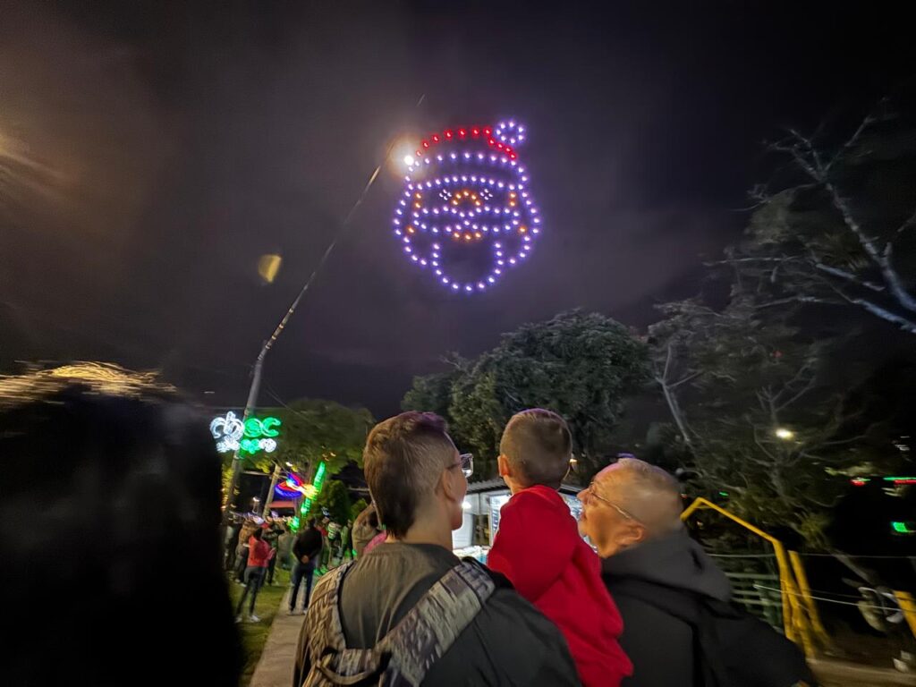 El espectáculo inició cuando 120 drones se elevaron sobre el sector de La Pradera. Las luces formaron símbolos que contaron quién es Dosquebradas y hacia dónde va: el nombre del municipio, la Primera Casa, las iglesias tradicionales y figuras navideñas.